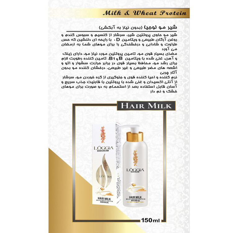 شیر موی لوجیا (بدون نیاز به آبکشی) حاوی پروتئین شیر ، سبوس گندم و آرگان طبیعی با رایحه ای دلنشین که حس طراوت و شادابی مو را به ارمغان می آورد همچنین مغذی بسیار قوی مو، تامین پروتئین لازم مو ، سرشار از کلسیم و آهن ؛غنی شده با ویتامین ب و ب۱، تامین کننده رطوبت لازم برای رشد و حفاظت مو ، محافظ مو در برابر حرارت سشوار و اتو و اشعه های مضر طبیعی و غیر طبیعی و نرم کننده قوی و جلو گیری از گره خوردن مو ، سرشار از آنتی اکسیدان و غنی شده با پروتئین با قابلیت جذب سریع و آسان قابل استفاده به دو صورت برای موهای خشک و نم دار نیز میباشد.